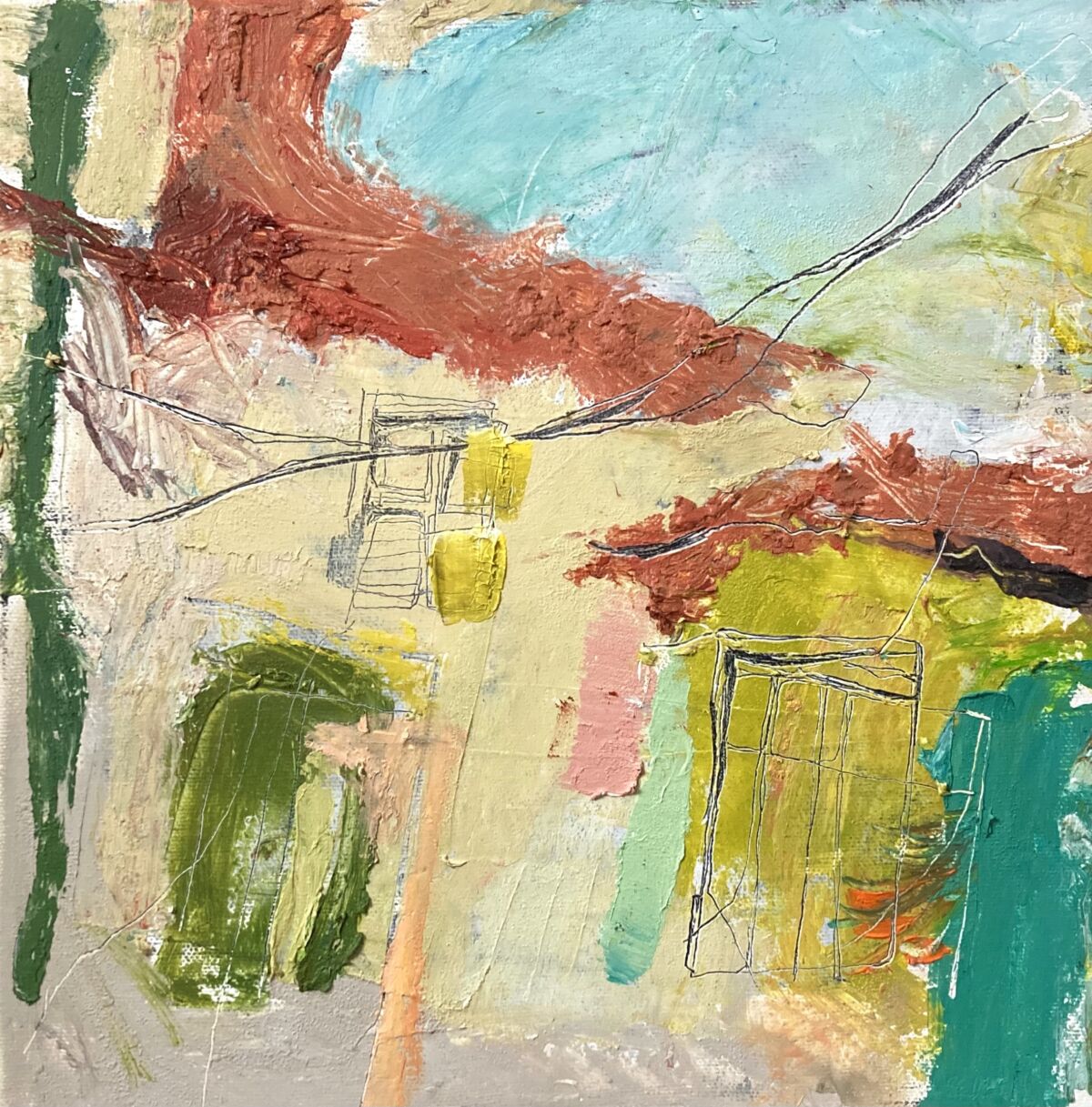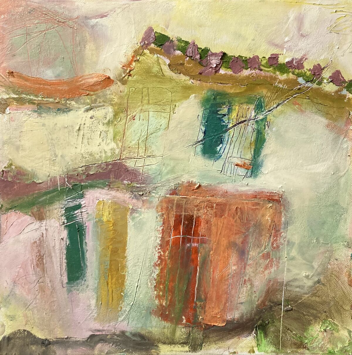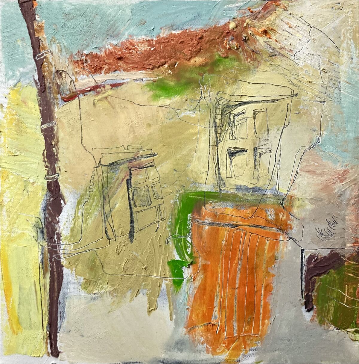 Red Roofs at Noon. Oil and cold wax on canvas, 30 x 30 cm. £450
